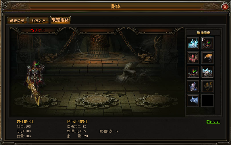 - 左键点击右侧战宠头像可进行附体,替换前需先解除战宠。