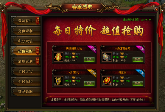活动期间内,每日0点刷特价珍贵道具,助您战力飞升,不要错过哦!