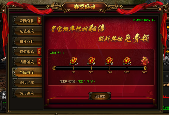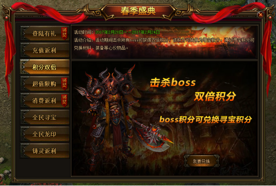 活动期间击杀所有boss可获得双倍积分,该积分可转换为寻宝积分,通过寻宝积分可兑换材料、装备等心仪物品