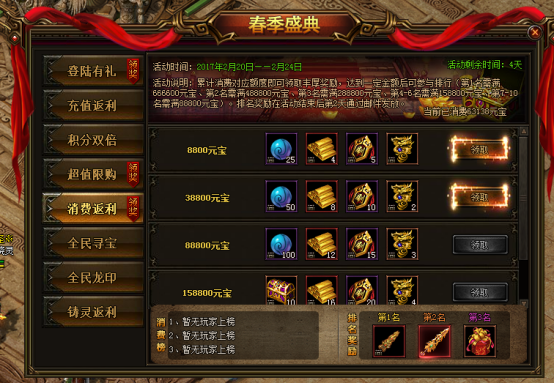 累计消费对应额度即可获得丰厚奖励,达到一定金额后可参与排行(第一名需满足666600元宝、第2名需满488800元宝、第3名需满288800元宝、第4-6名需满158800元宝、第7-10名需满88800元宝。)排名奖励在活动结束后第2天通用邮件发放。