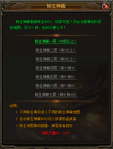 转生神殿分为7层,不同转生等级可进入对应的转生神殿地图。击杀转生神殿BOSS可获得极品装备。