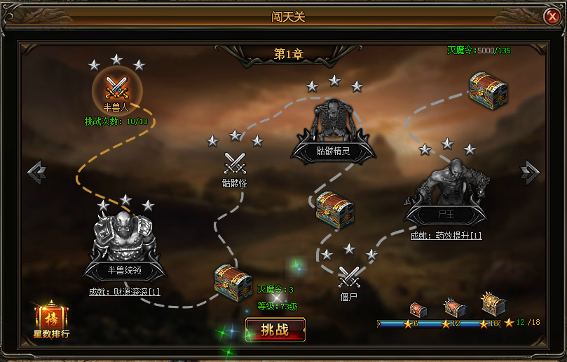 玩家每天不限时间可随时进入天关挑战,到达73级进入,每天可花费灭魔令进入